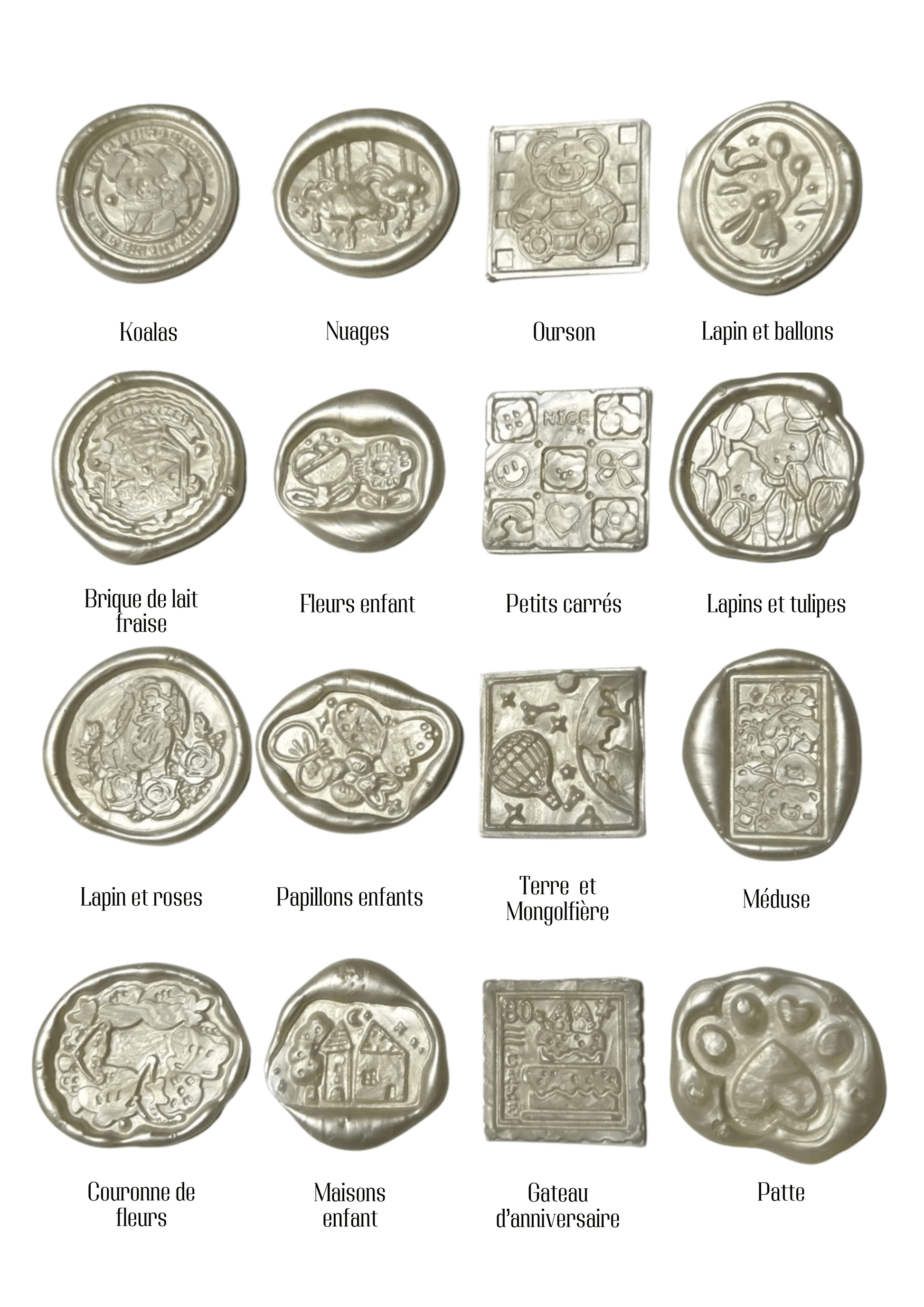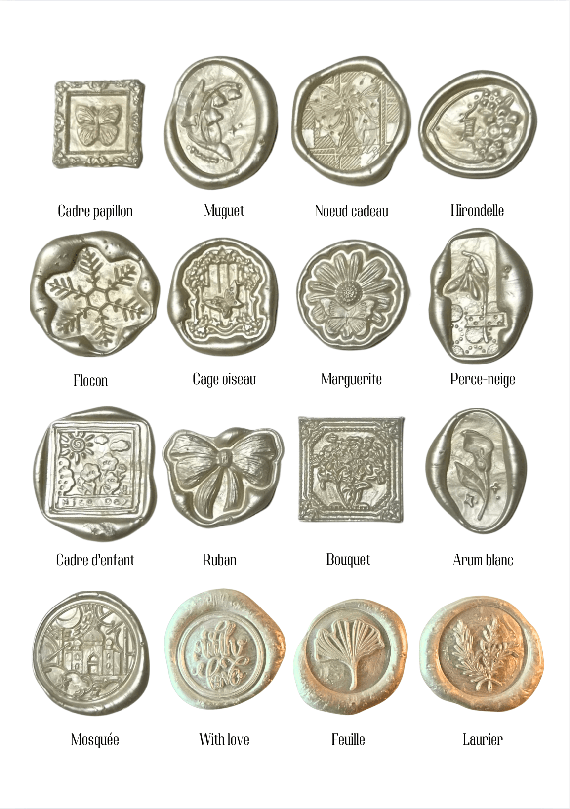 • Choix du motif de cachet et de la couleur de la cire (après achat un mail vous sera envoyé pour connaître votre choix)