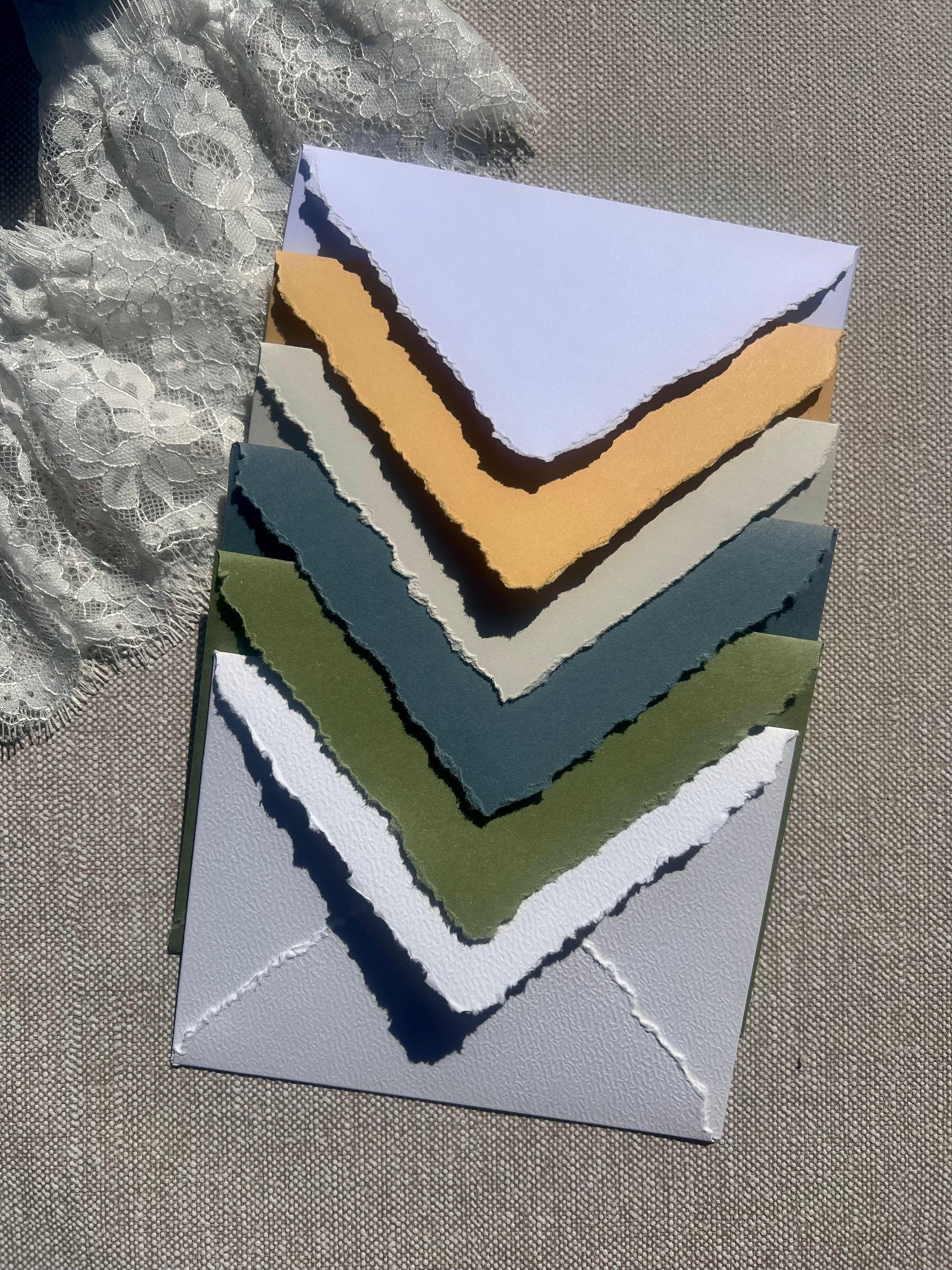 Découvrez nos enveloppes faites à la main, disponibles en plusieurs coloris et finitions pour sublimer vos invitations et courriers. Un détail raffiné pour une touche d’élégance unique.