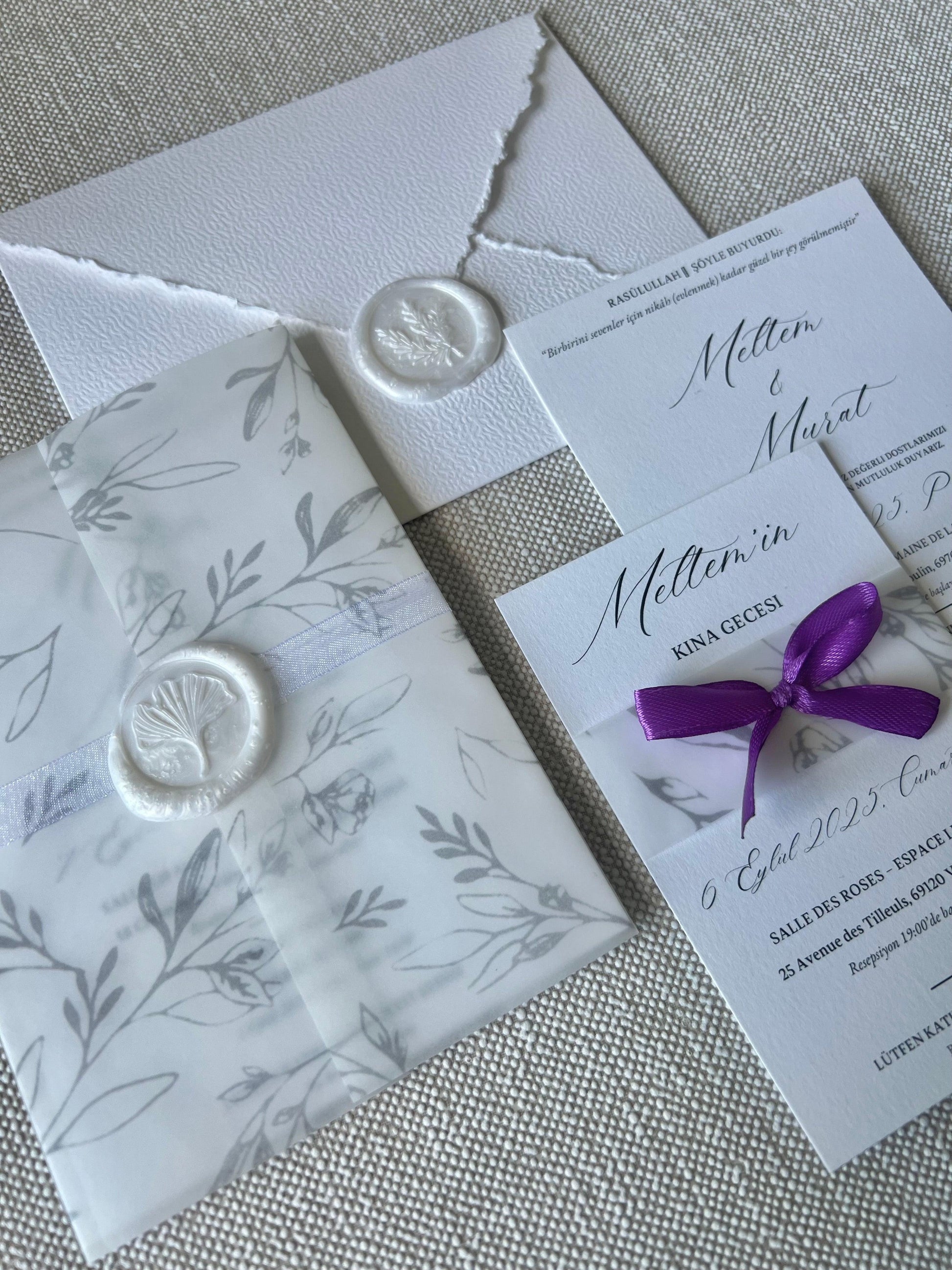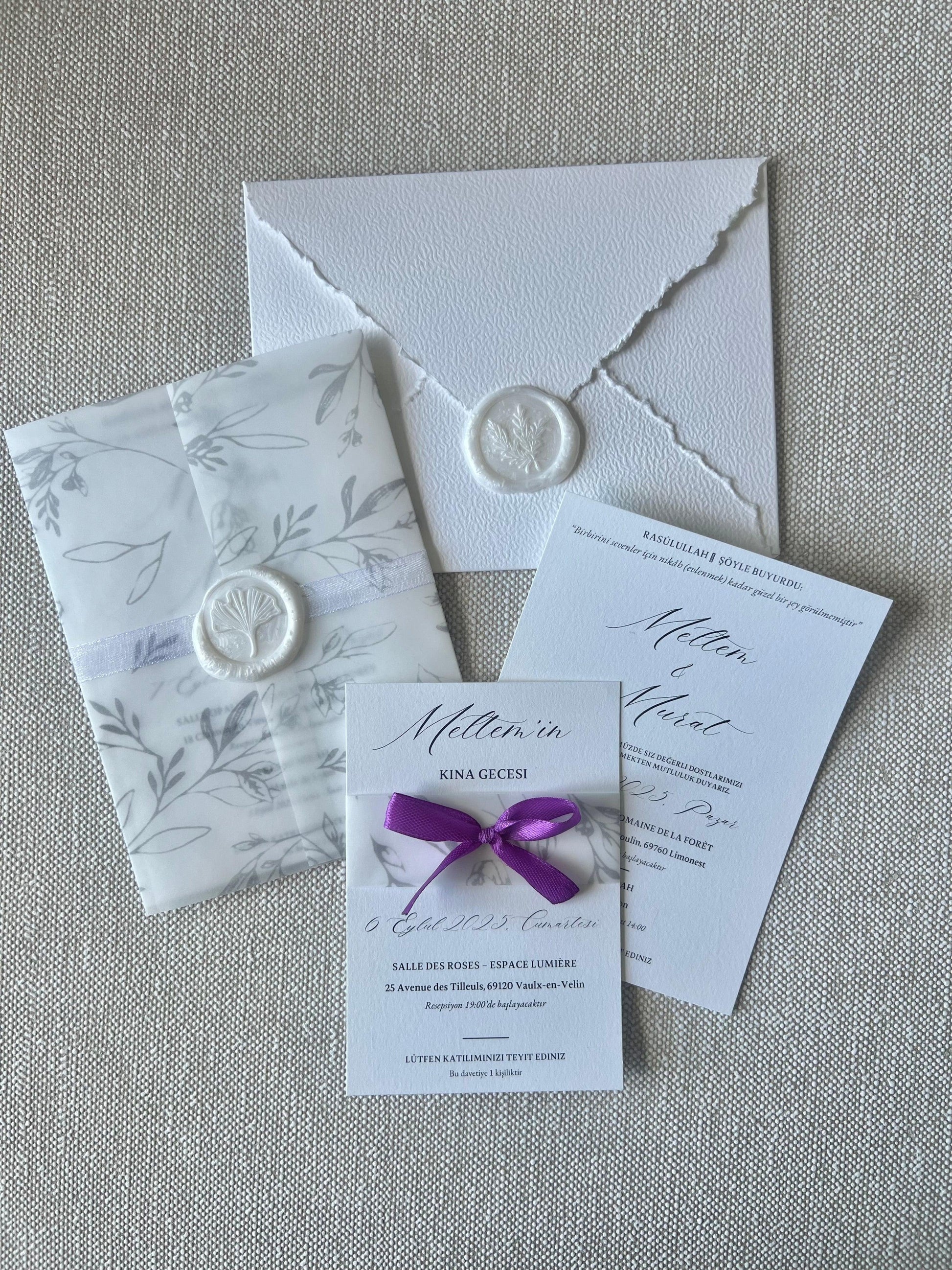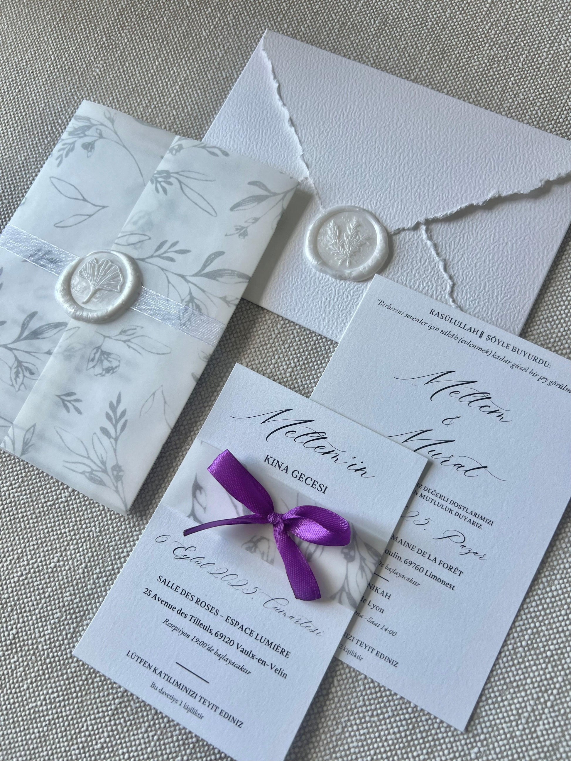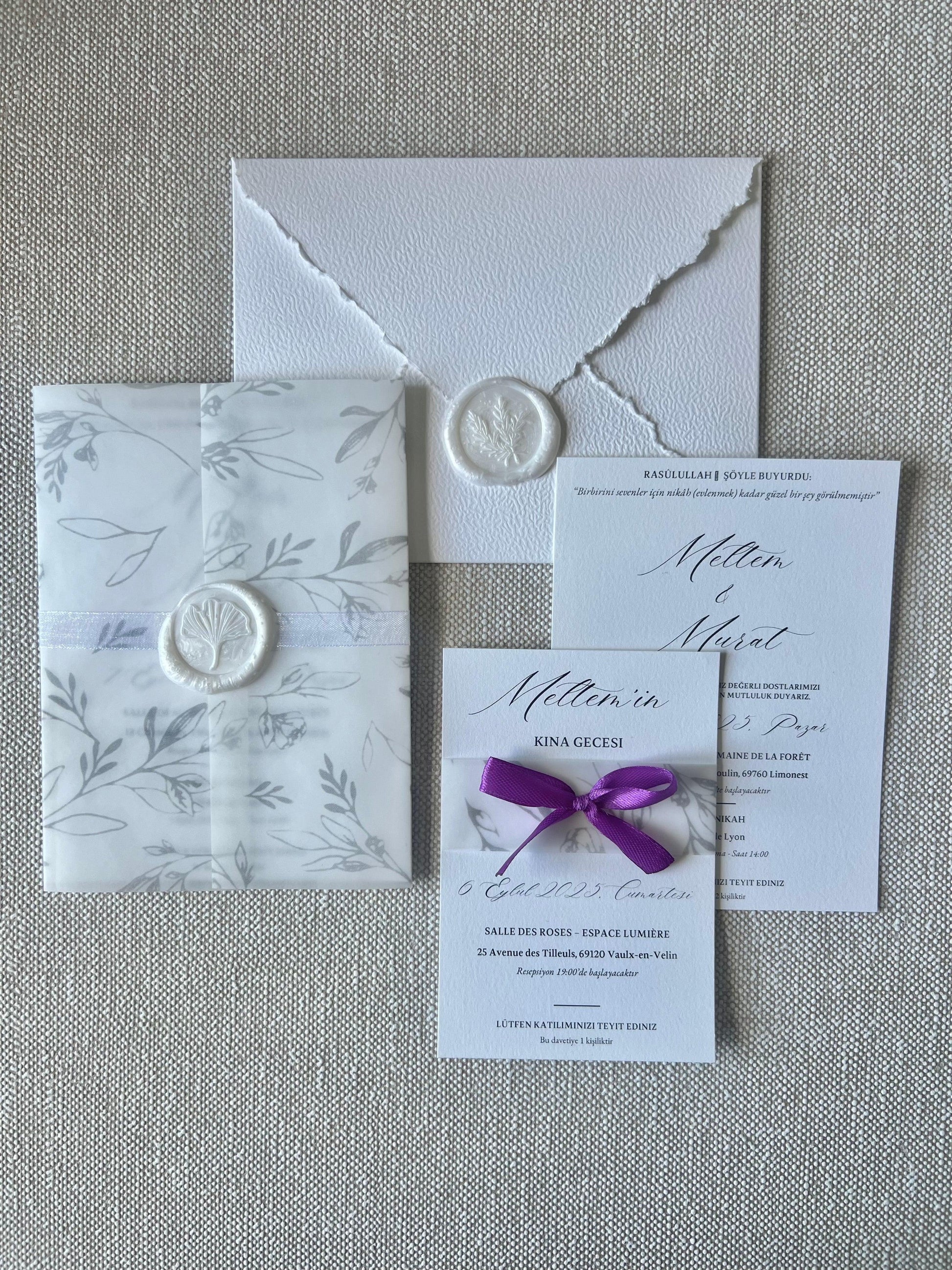 Offrez une invitation empreinte d’élégance avec le faire-part MELTEM. Son design raffiné, sublimé par une invitation et une carte henné, allie authenticité et sophistication. Niché dans une enveloppe artisanale faite main et un papier vellum imprimé, il annonce avec délicatesse un événement d’exception.