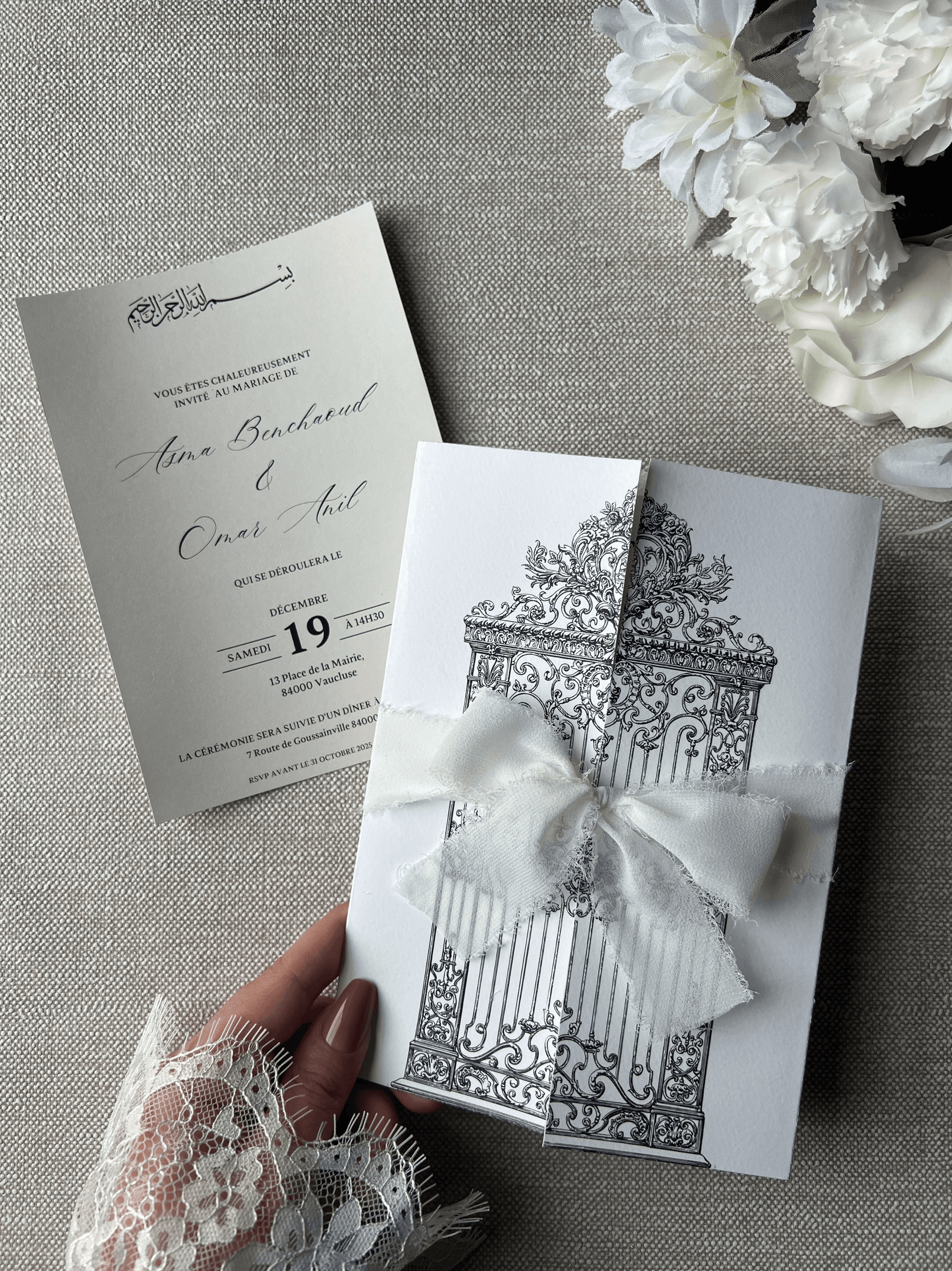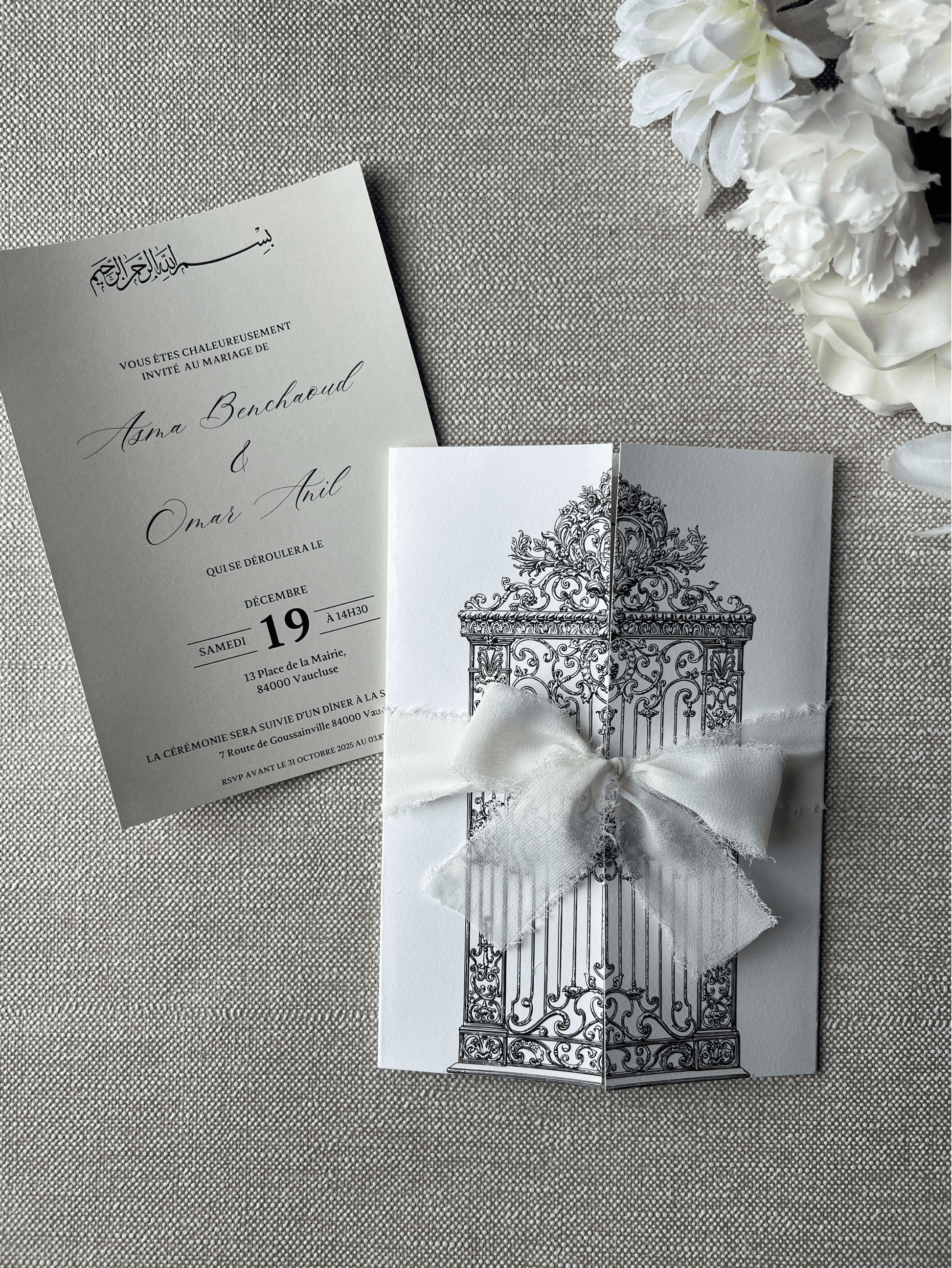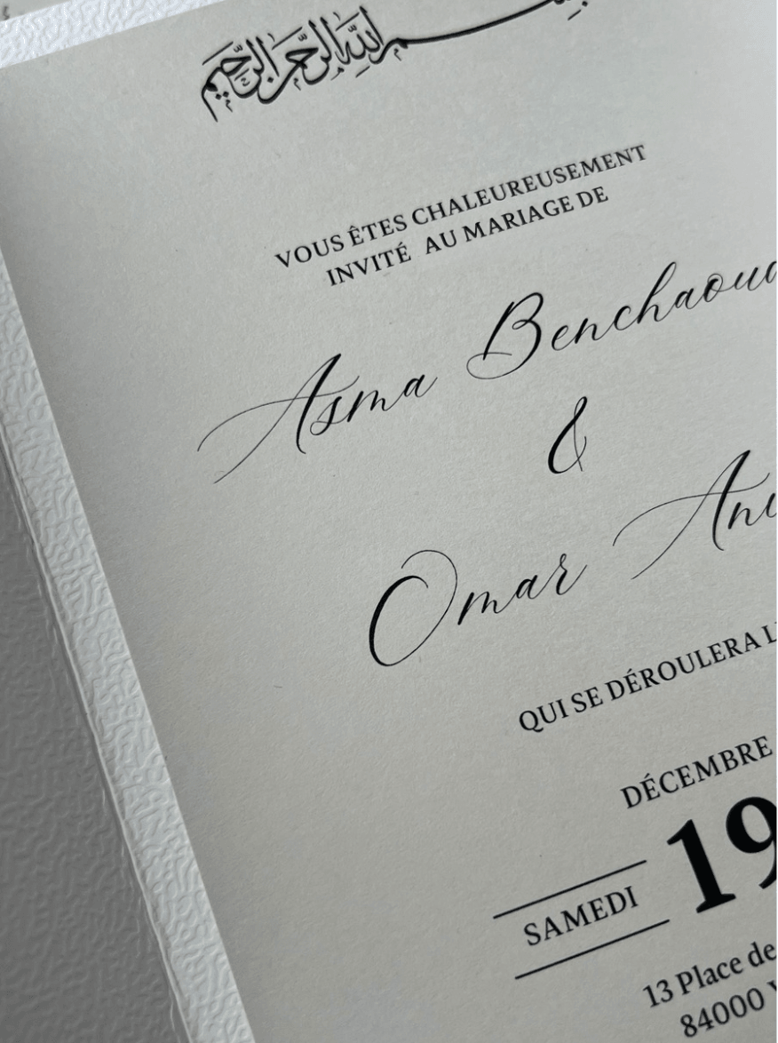 Offrez une invitation empreinte d’élégance avec le faire-part Jannah. Son design raffiné, inspiré d’un portail majestueux, allie sobriété et sophistication. Niché dans une enveloppe texturée blanche à double porte, il annonce avec délicatesse un événement d’exception.