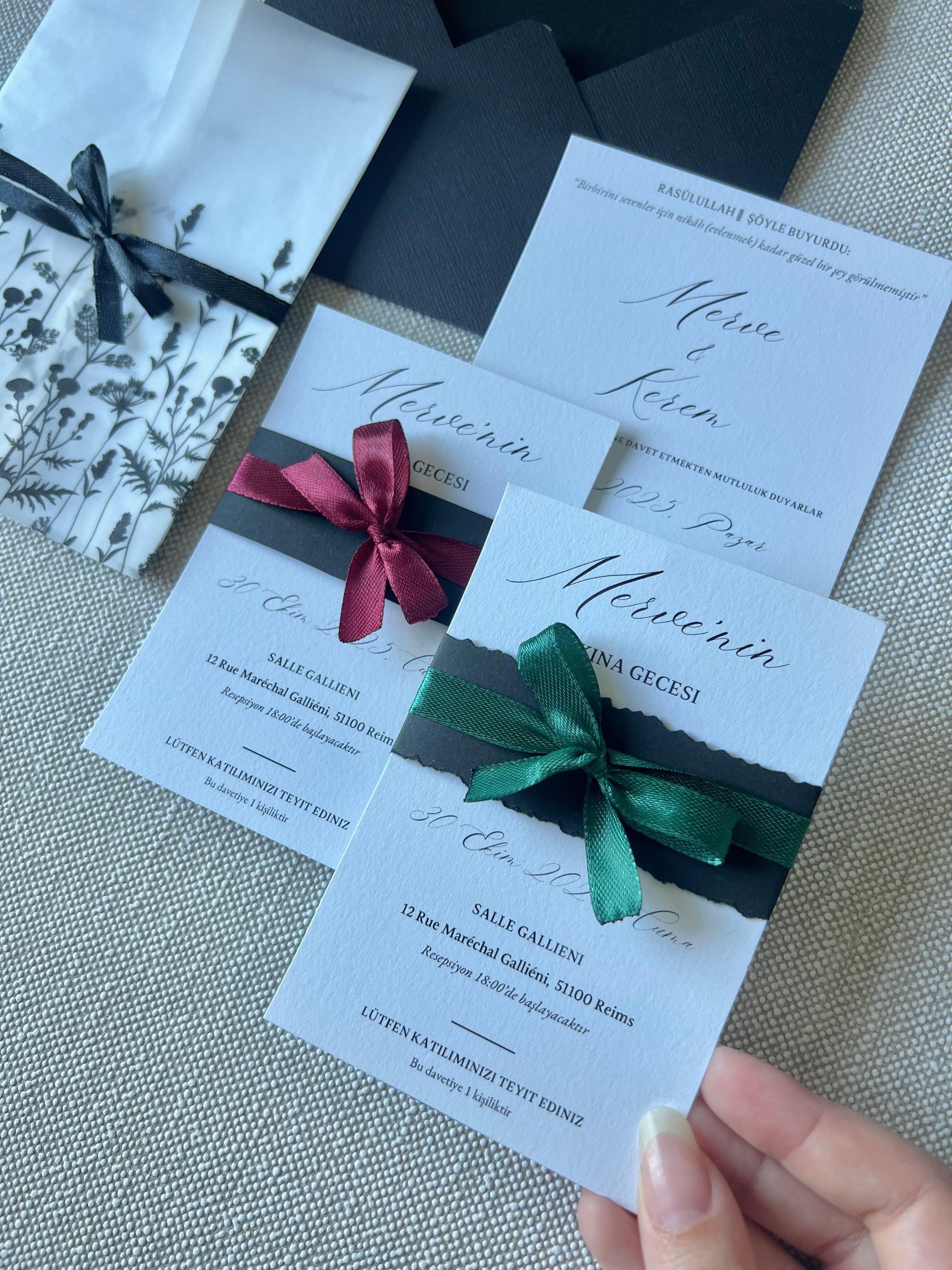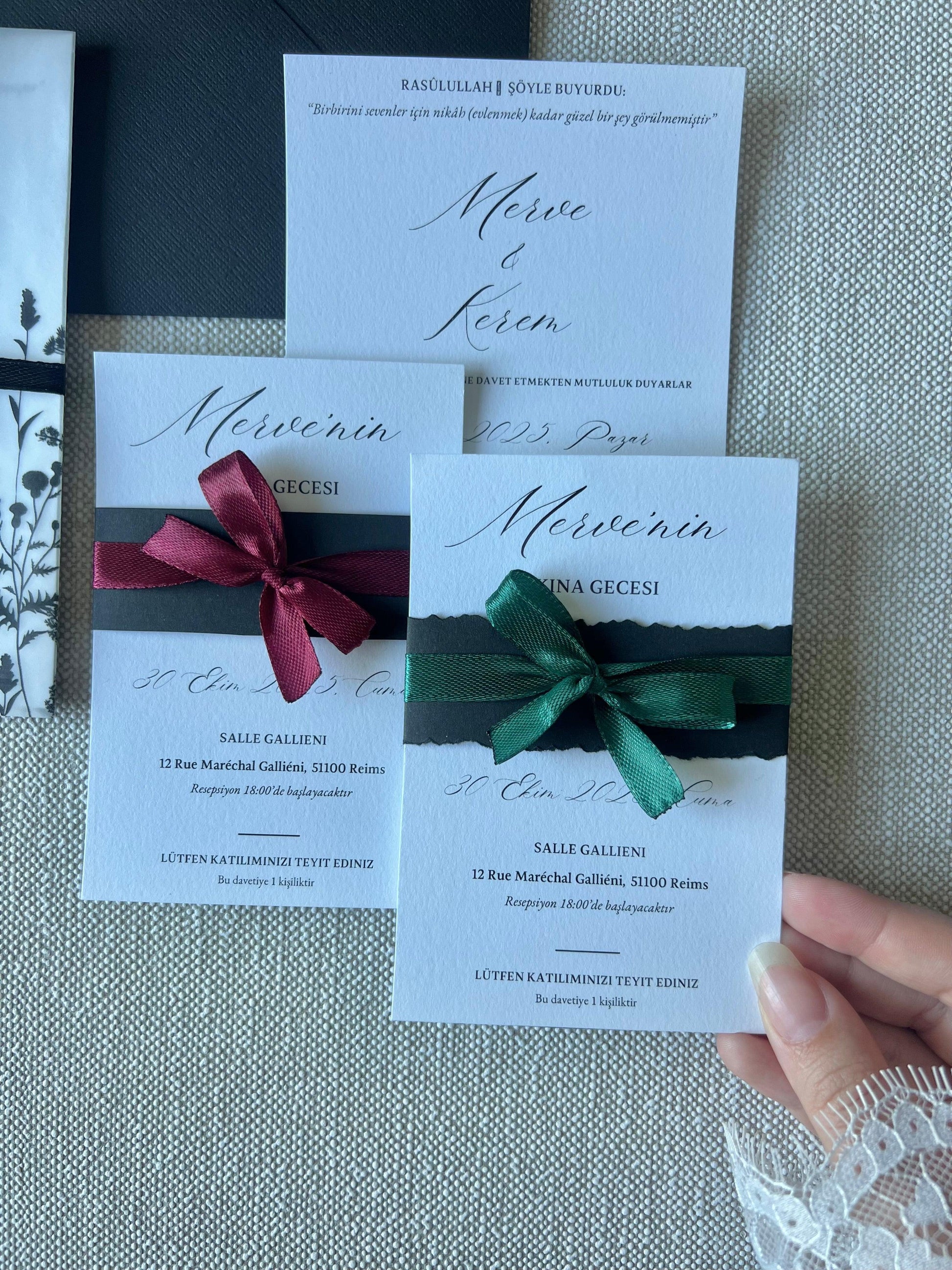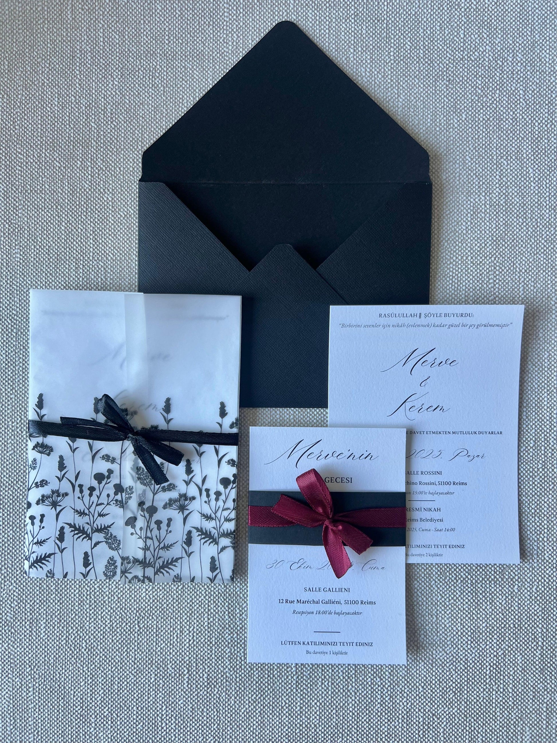 Offrez une invitation empreinte d’élégance avec le faire-part MERVE. Son design raffiné, sublimé par une invitation et une carte henné, allie authenticité et sophistication. Niché dans une enveloppe artisanale faite main et un papier vellum imprimé, il annonce avec délicatesse un événement d’exception.