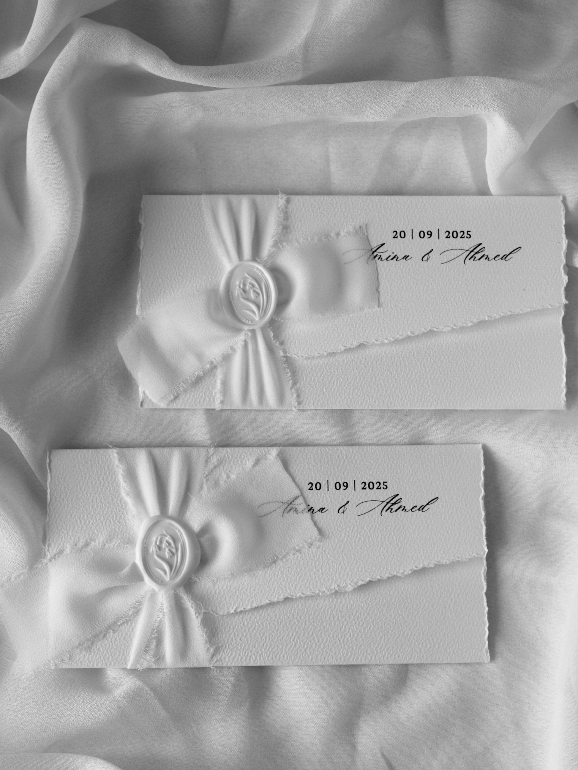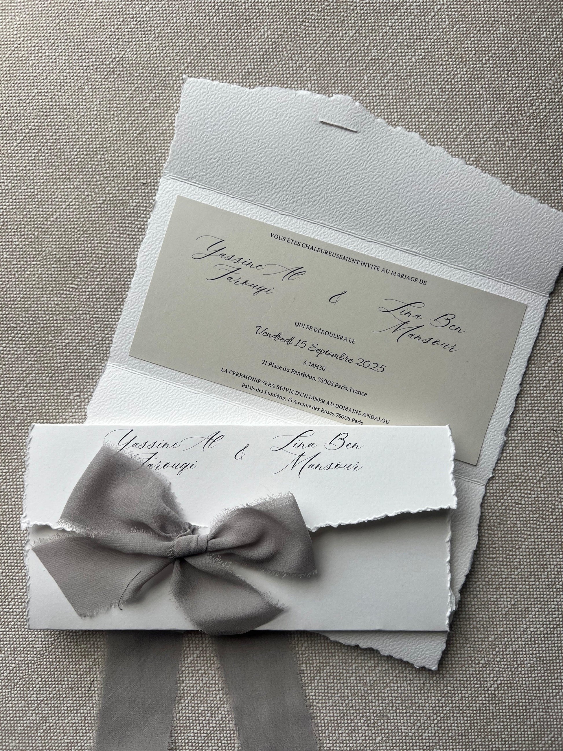Offrez une invitation empreinte d’élégance avec le faire-part SARAH. Son design raffiné, sublimé par une invitation et une enveloppe aux bords déchirés à la main, allie authenticité et sophistication. Niché dans une enveloppe artisanale faite main, il annonce avec délicatesse un événement d’exception.