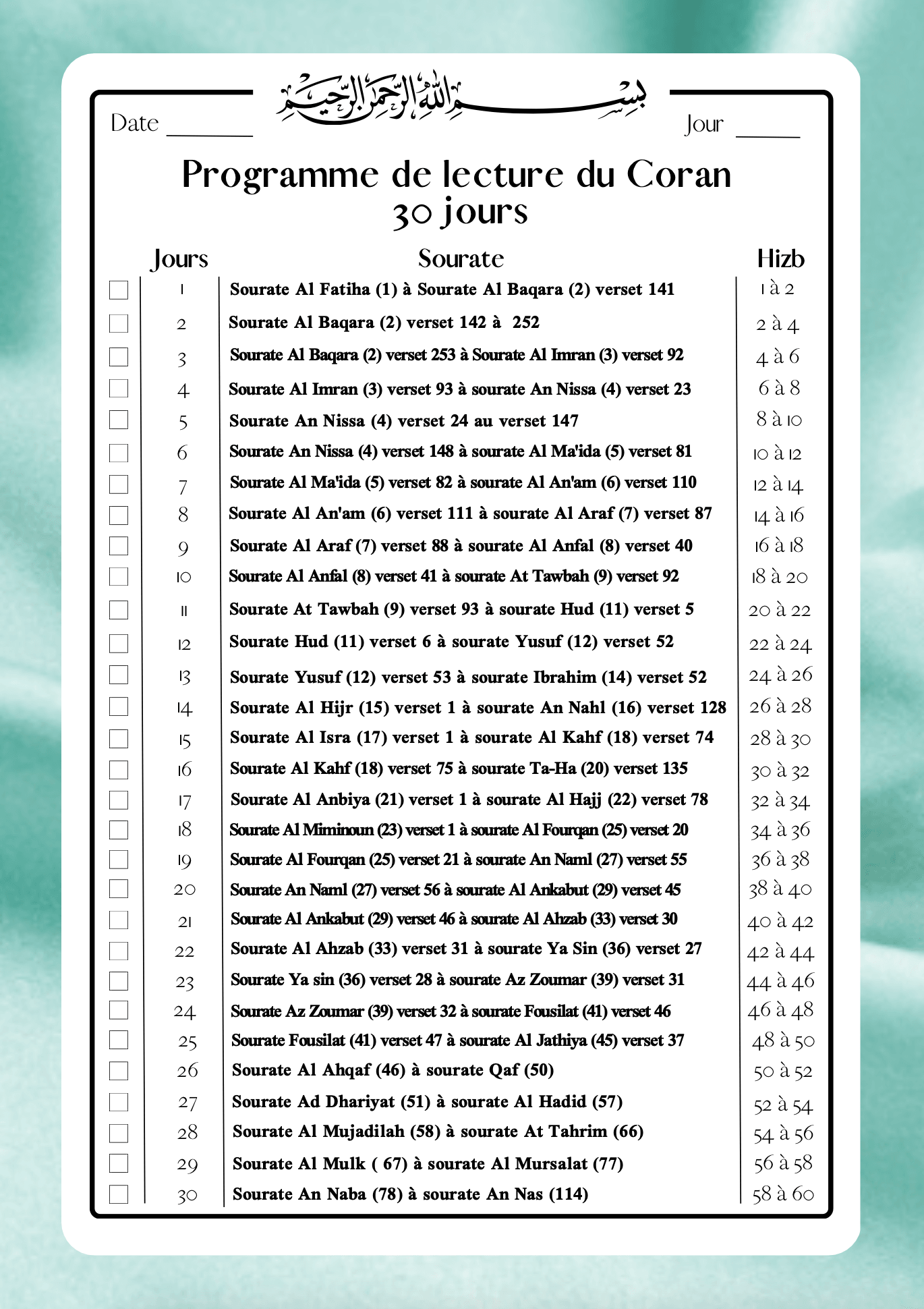 Ce programme de lecture est conçu pour vous aider à lire le Coran en 30 jours, avec une répartition quotidienne claire et accessible. Idéal pour le mois de Ramadan ou pour toute autre période de lecture intensive.