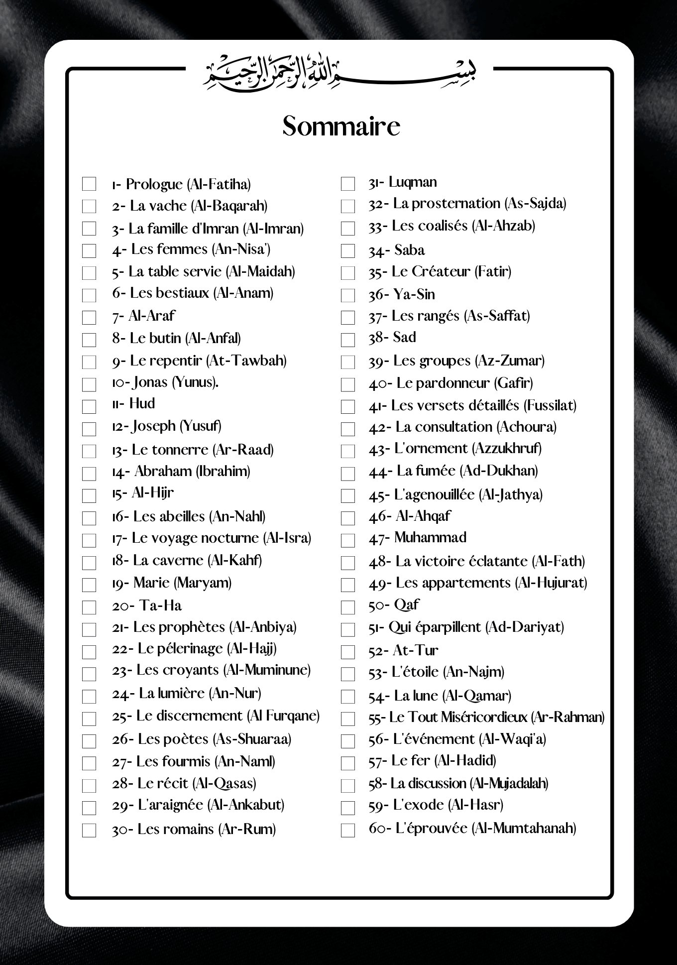 Ce suivi de lecture du Coran est conçu pour vous accompagner tout au long du mois de Ramadan. Suivez vos progrès quotidiens, notez vos réflexions et restez motivé dans votre lecture quotidienne du Coran.